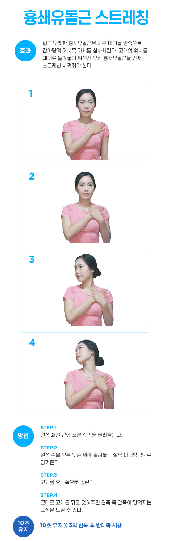 - 오른손으로 머리를 잡아 옆으로 천천히 당겨 목 옆 근육을 15초간 이완.